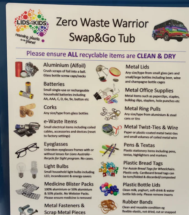 The hard to recycle station now includes a Lids4Kids Zero Waste Warrior collection bin.