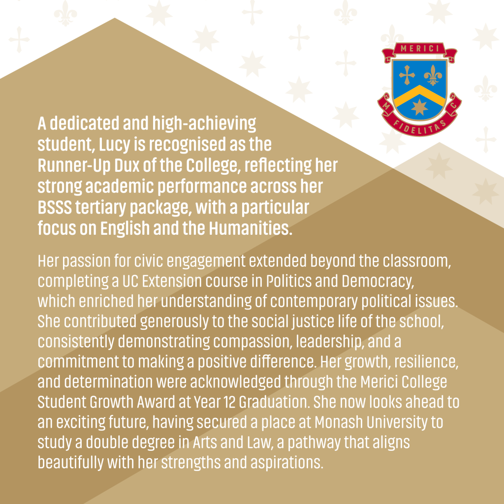A dedicated and high‑achieving student, Lucy is recognised as the Runner‑Up Dux of the College, reflecting her strong academic performance across her BSSS tertiary package, with a particular focus on English and the Humanities. Her passion for civic engagement extended beyond the classroom, completing a UC Extension course in Politics and Democracy, which enriched her understanding of contemporary political issues. She contributed generously to the social justice life of the school, consistently demonstrating compassion, leadership, and a commitment to making a positive difference. Her growth, resilience, and determination were acknowledged through the Merici College Student Growth Award at Year 12 Graduation. She now looks ahead to an exciting future, having secured a place at Monash University to study a double degree in Arts and Law, a pathway that aligns beautifully with her strengths and aspirations.
